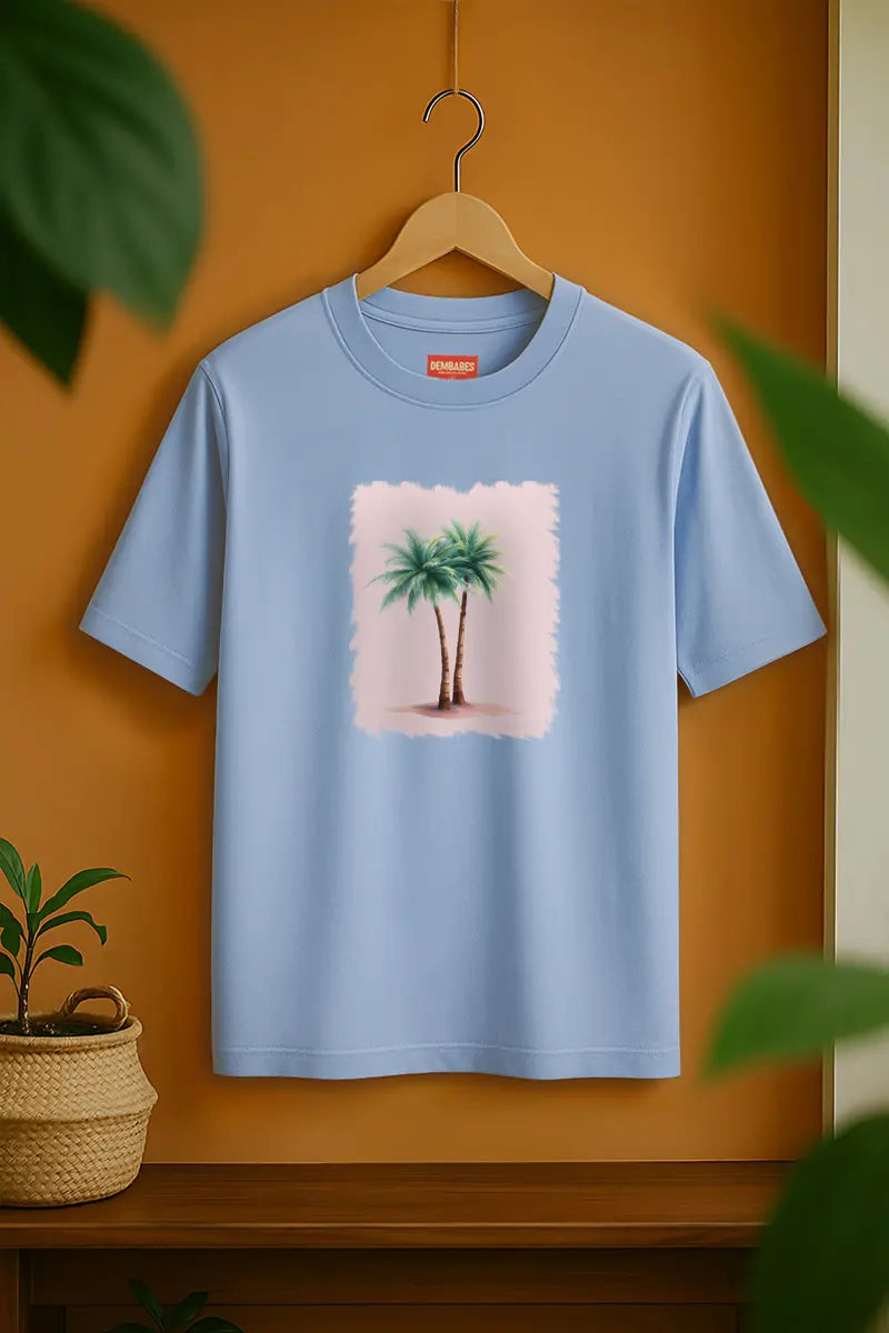 This beach blue tee features twin coconut palms swaying on a faded pastel backdrop. A soft visual that screams calm while keeping your streetwear loud. Chill fit, unisex vibe.